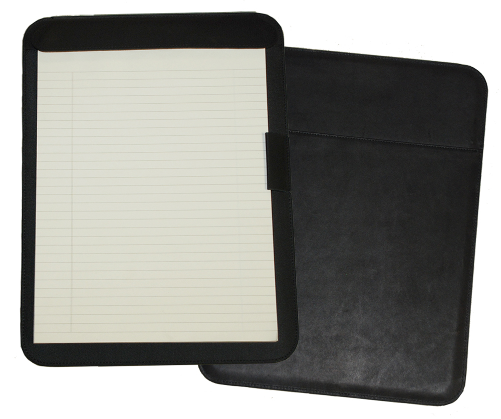 9 7/8" x 13 1/8", with a stitched leather pen loop and an extra pocket on the back. An 8 1/2" x 11" ruled ivory pad is included.
