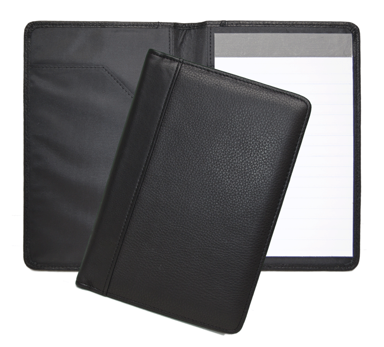 This genuine leather junior pad holder has hand-stitched, padded covers, with turned edges and a taffeta lining. Inside, a stitched slash pocket and a pen slot. A 5" x 8" writing pad is included. 6 1/8" x 9 1/3". Made in black.