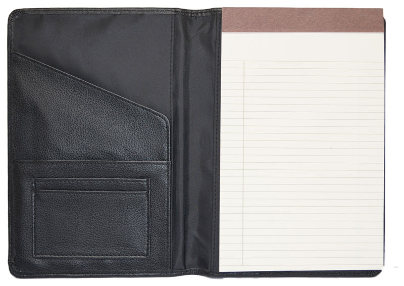 Soft, leather-like textured polyurethane cover with perimeter stitching. Fabric lining and elastic pen loop. Inside slots and pockets for notes and business cards. A 5" x 8" ivory pad is included. Size: 8 1/8" x 5 3/4" x 7/8". Available in black faux leather.