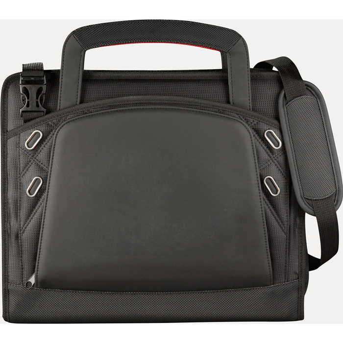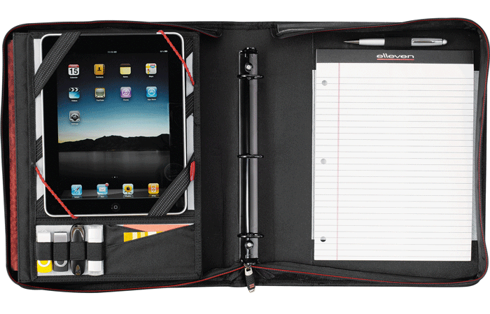 Zippered closure. Its TechTrap elastic interior organizer holds an iPad securely. Front cover access pocket with business card holders and media organizers. Four USB memory flash drive holders, two business card holders and elastic pen loop. Gusseted document pockets. Detachable, adjustable shoulder strap and hideaway handles. Removable 1.25" 3-ring binder. Includes an 8.5" x 11" writing pad. Made in black. 12.5"x 14.63"x 2.75".