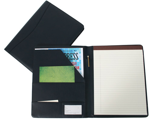 Bonded leather writing padfolios for executives in the office or business travels. Inside slots and pockets for notes and business cards and an ID window. Pen slot (no pen included). An 8 1/2" x 8" ruled writing pad is included. It can also accommodate an A4 pad. Measures 12 1/2" x 9 3/4" x 3/4". Available in Black, Tan, Navy Blue, Custom debossed personalization is available—your name, initials, monogram, or a seal or logo.