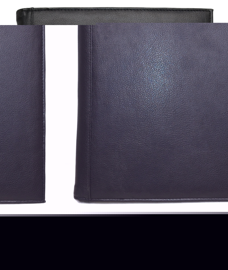 Soft, leather-like textured polyurethane cover with perimeter stitching. Fabric lining and elastic pen loop. Inside slots and pockets for notes and business cards. Full-height vertical pockets inside front and back covers. An 8 1/2" x 11" ivory pad is included. Size: 9 1/2" x12 1/4". Made in black faux leather.
