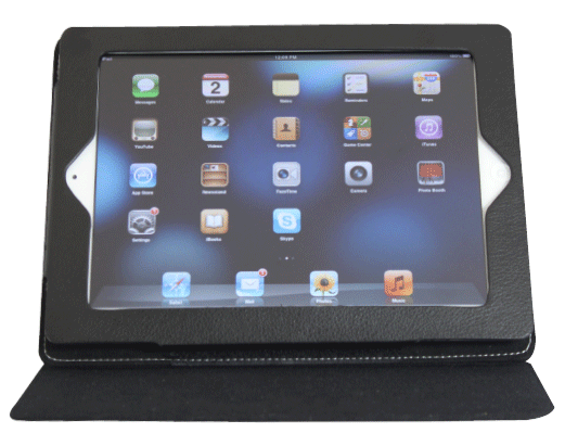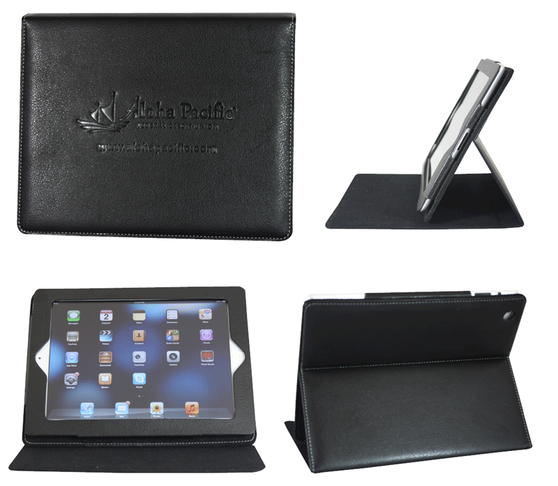 Made of black premium simulated leather, with white stitching. An elastic strap keeps the case closed and the iPad® secure. The padded case protects the iPad®, and offers adjustable folding, so the tablet can be used at multiple angles. Folder size: 9 3/4" W x 7 3/4" H x 1" D. White gift box included.