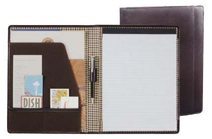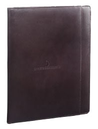 Styled in deep mahogany top grain leather, this classic is the ideal gift for the busy executive. The interior includes pockets for documents and business cards. Includes 8.5" x 11" perforated writing pad. Gift box. 12.5" (H) x 9.75" (W) x 1" (L).