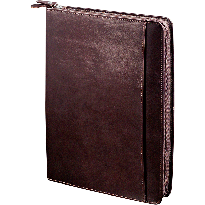 Made of deep mahogany top grain leather, with a zippered closure. The interior organizer has a gusseted file pocket and phone pockets. (Accessories shown not included.) Includes an 8.5" x 11" perforated writing pad. Two-piece gift box. Measures 13" x 10.25" x 1.62".