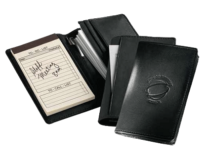 A gunmetal mini pen and a mini pad are included in this 4 1/2" x 3" x 1/2" note taker. Gusseted business card holder, plus an extra outside pocket. Refill mini pads are available. Made in black genuine leather.