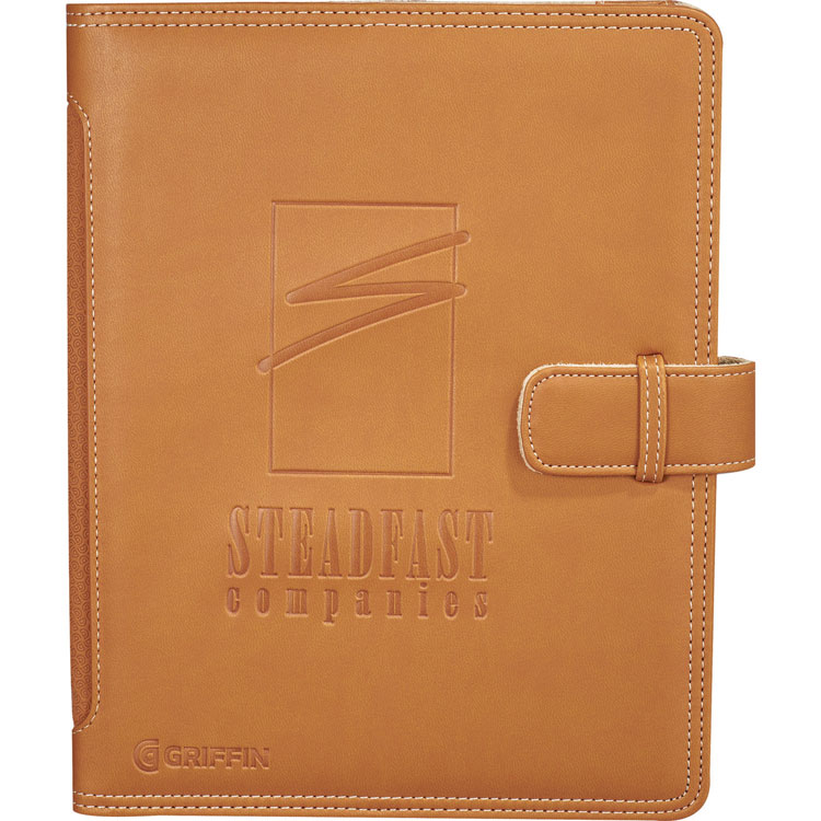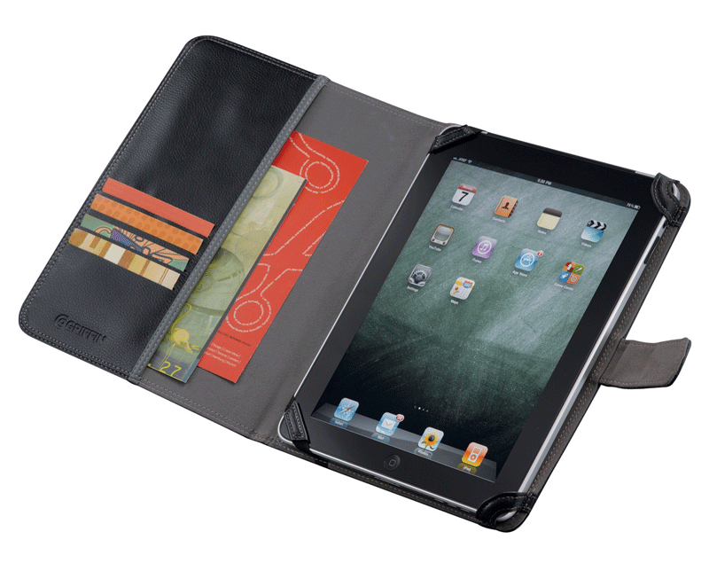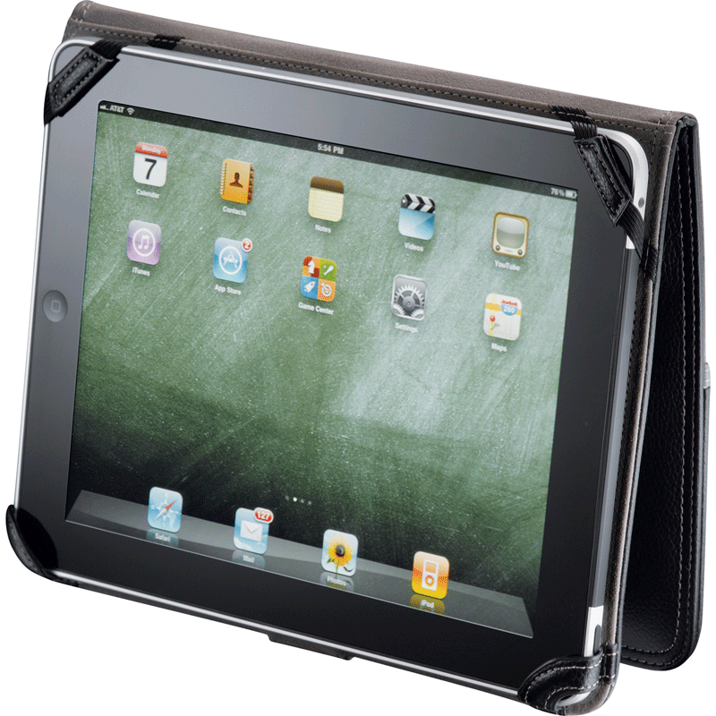 The folio cover flips open to reveal the Multi-Touch display, then closes like a book for privacy and protection. A microsuede lining protects your iPad® from scratches and smudges and the case is held shut by a tab closure. The inner cover includes pockets for an ID, business cards and more. On the back is a small cutout for the iPad2® camera. This case fits iPad® 1 and 2, and includes a white gift box. Measures 10" x 8.3" x 1". Made of durable vinyl and available in tan or brown.