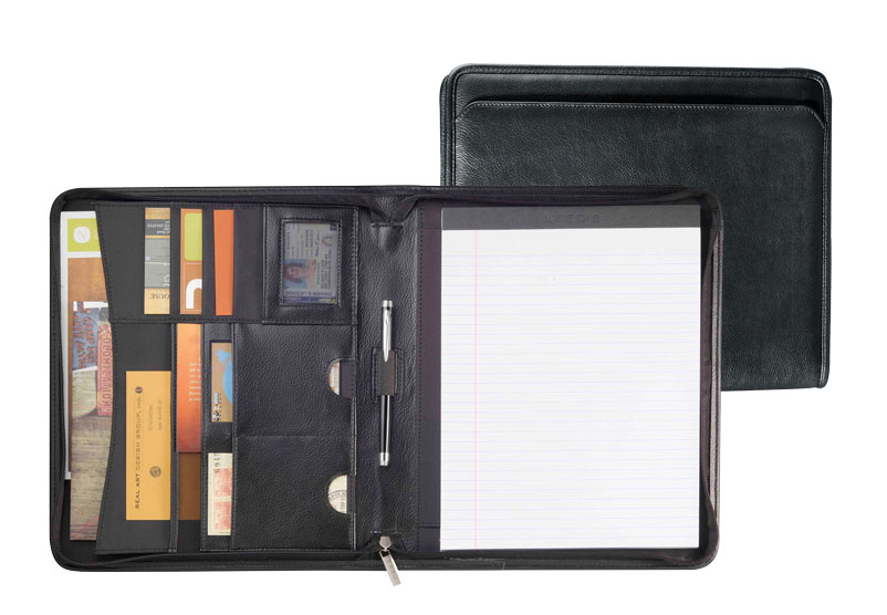 Zippered closure. Interior organizer with gusseted file pocket and business card pockets. Pen loop. Includes an 8.5" x 11" writing pad. Made of pebble-grain genuine leather, and available in black. 13" x 10.5" x 1.25". A one-piece gift box is included.