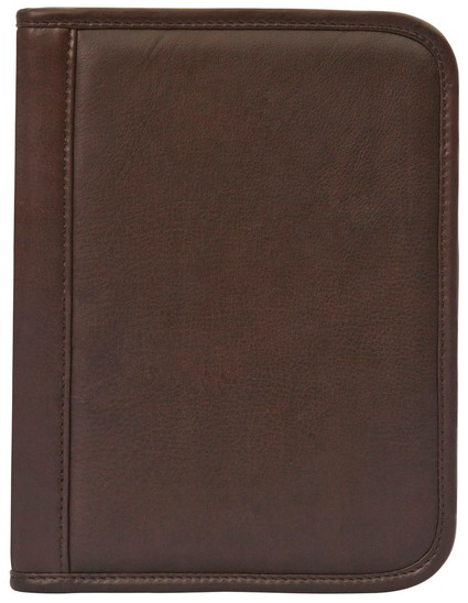 Small full-grain cowhide leather padfolio has two inside pockets for business cards and receipts. Pen holder (retractable pen included). A ruled 5 x 8 note pad is included. 9" (H) x 6 3/4" (W) x 3/4" (L). Available in black, brown or brick red.