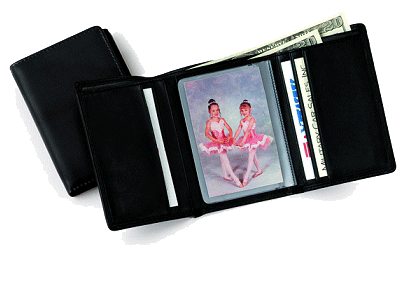 Two currency compartments, six credit-card slots and a four-flip plastic photo/ID insert. Leather-lined inside back cover. Available in tan Florentine Napa leather. 4 1/2" x 3 1/4" x 3/4". Gift boxed.