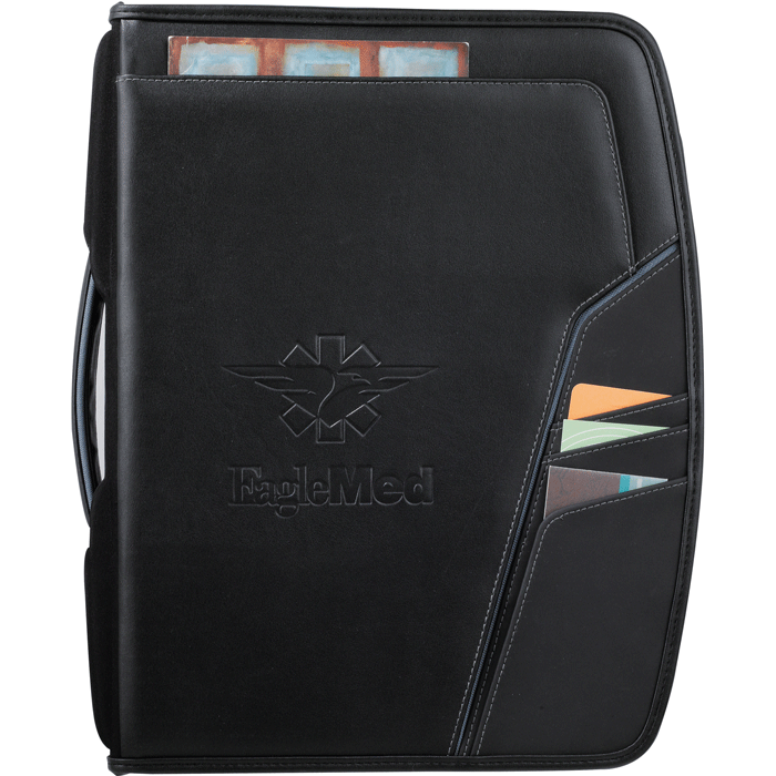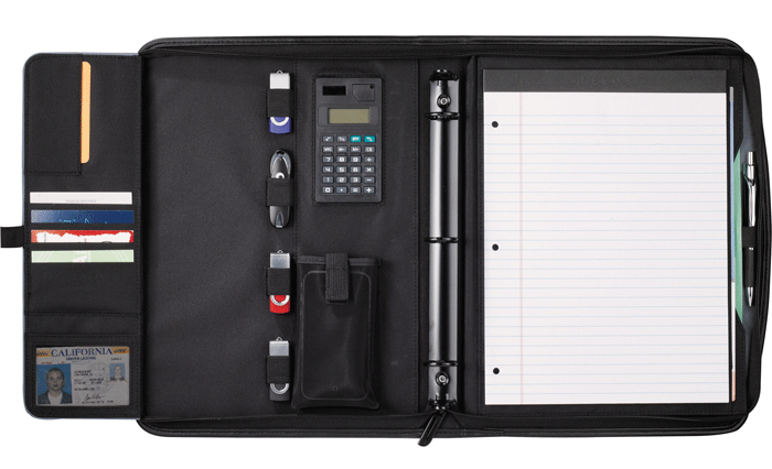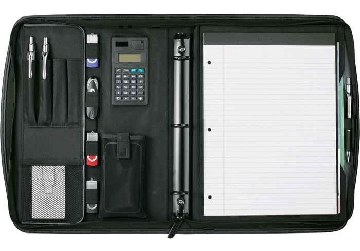 Contour design, with a zippered closure and integrated carrying handle. Document pocket and three business card holders on the front cover. Four pen ports, 2.25" x 4.25" solar calculator, mesh utility pocket, four USB memory flash drive loops and mesh phone holder. Four inside business card holders and a mesh ID window in a swing-out divider. Removable 1.25" ring binder, plus a gusseted document pocket. Includes an 8.5" x 11" writing pad. 14" x 11.5" x 2".