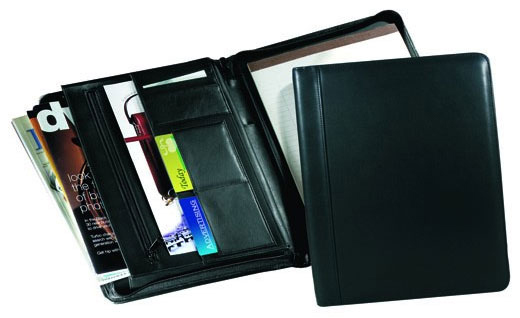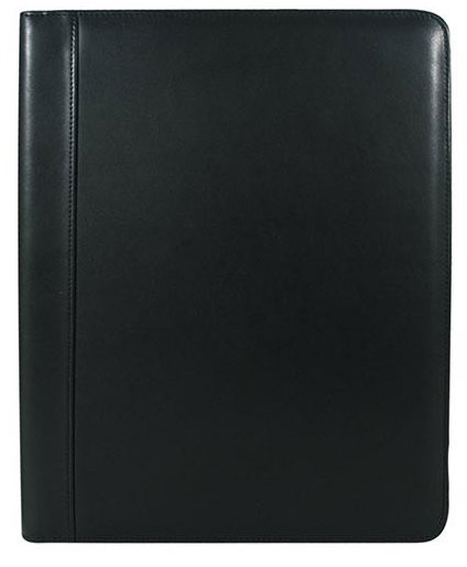 Made of fine Florentine Napa leather, this zippered pad holder has a large, gusseted interior pocket, zippered and additional open pockets, three credit/business card slots and two disk holders, plus a pen slot (pen not included). Nylon/Leather interior. Reversible pad positioning ensures comfortable right- or left-hand use. An 8 1/2" x 11" ivory writing pad is included (refills available). 13 5/8" x 10 1/4" x 1". Custom debossed personalization is available—your name, initials, monogram, or a seal or logo. Available only in black.