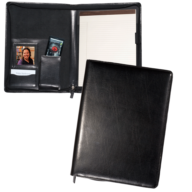 Cowhide leather with 1680d nylon and faux suede lining. An internal magnetic frame for a 2 1/2" x 2 1/2" photo, plus pockets for business cards, a cell phone and documents. Includes an 8 1/2" x 11" ruled pad. Leather pen loop. Dimensions: 9 1/2" x 12 1/2" x 1". Available in black.