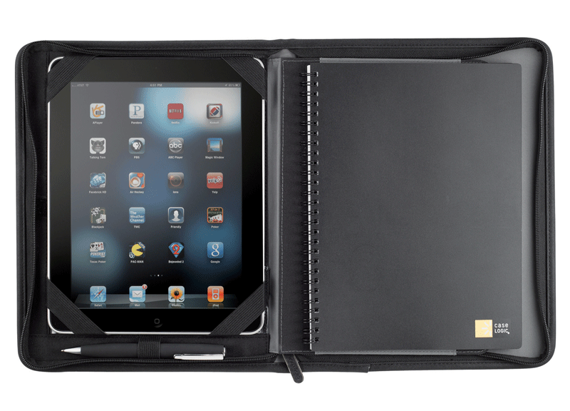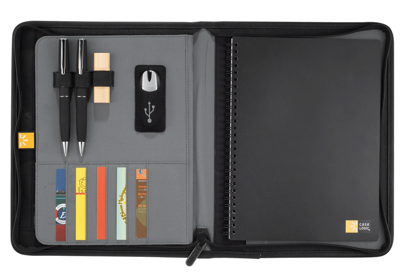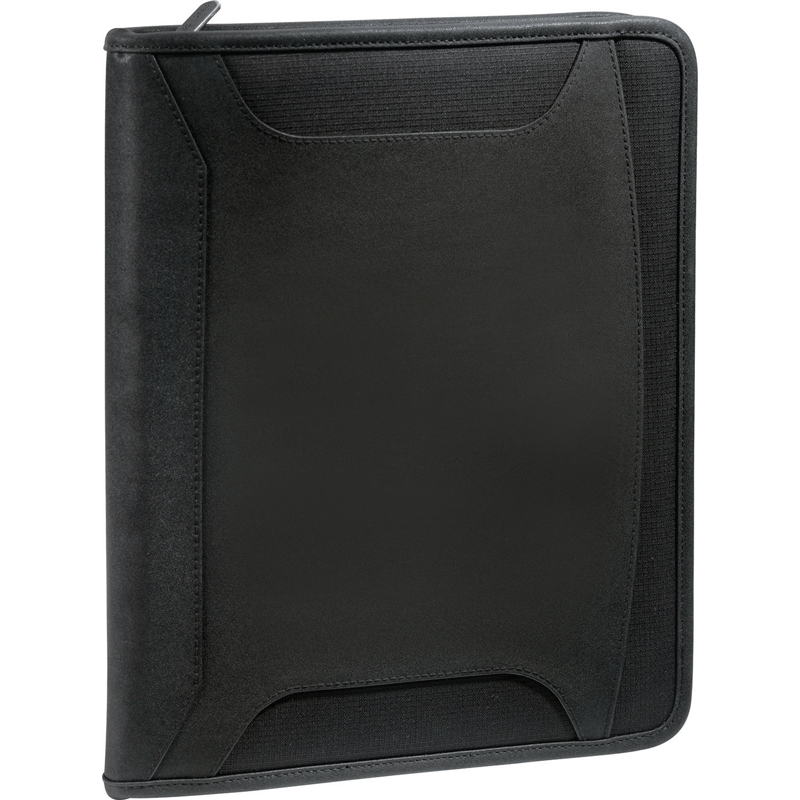 Zippered closure, with an outside pocket on the front cover. A secure media panel holds an iPad® and most other e-readers and tablets, and has a stylus holder. The organizational panel features a USB port, five business card holders and three pen loops. Velcro® closure document holder. It includes a 60-sheet 10" x 7 1/2" journal, with a second location for the journal on media panel. Also includes an information card listing the many functions of the padfolio. Made of textured black UltraHyde.